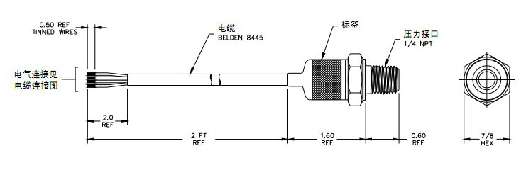 本產品的壓力腔采用17-4PH不銹鋼單件一體式結構加工而成。其標準壓力接口采用1/4NPT外螺紋接頭,因而可以保證較好的密封性能。本產品的特點是無○形圈、無焊縫、無硅油或其他有機物,經久耐用。